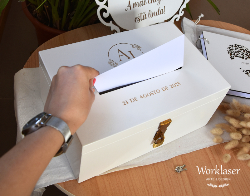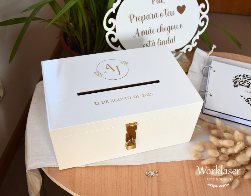 Caixa em madeira pintada de branco.