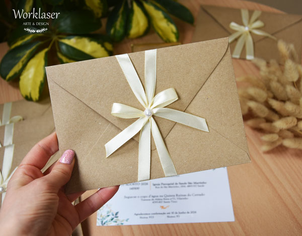 Material: Papel branco 250gm com ligeiro brilho e envelope craft 180gm