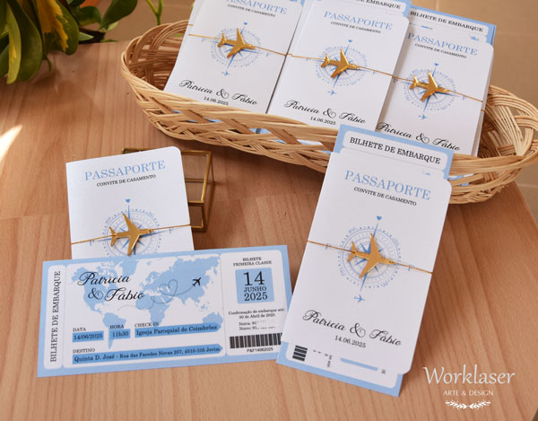 Tamanho do convite com o bilhete no interior do passaporte: 9,5cm x 19cm