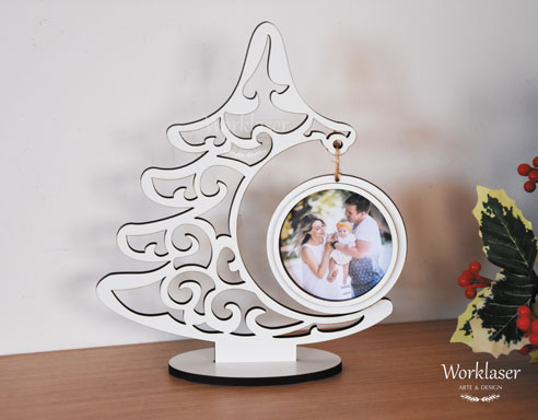 Árvore de natal em madeira escura ou em mdf branco com bola e fotografia